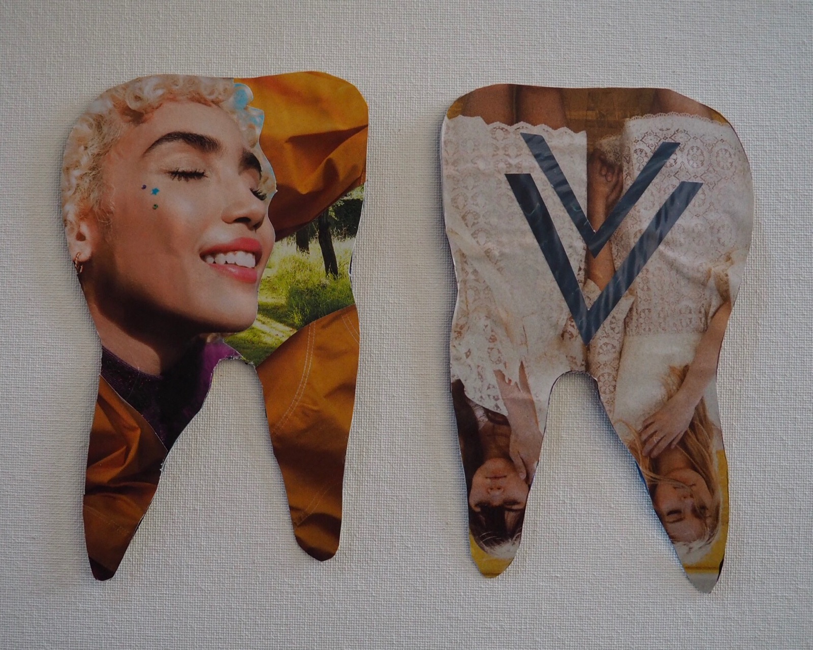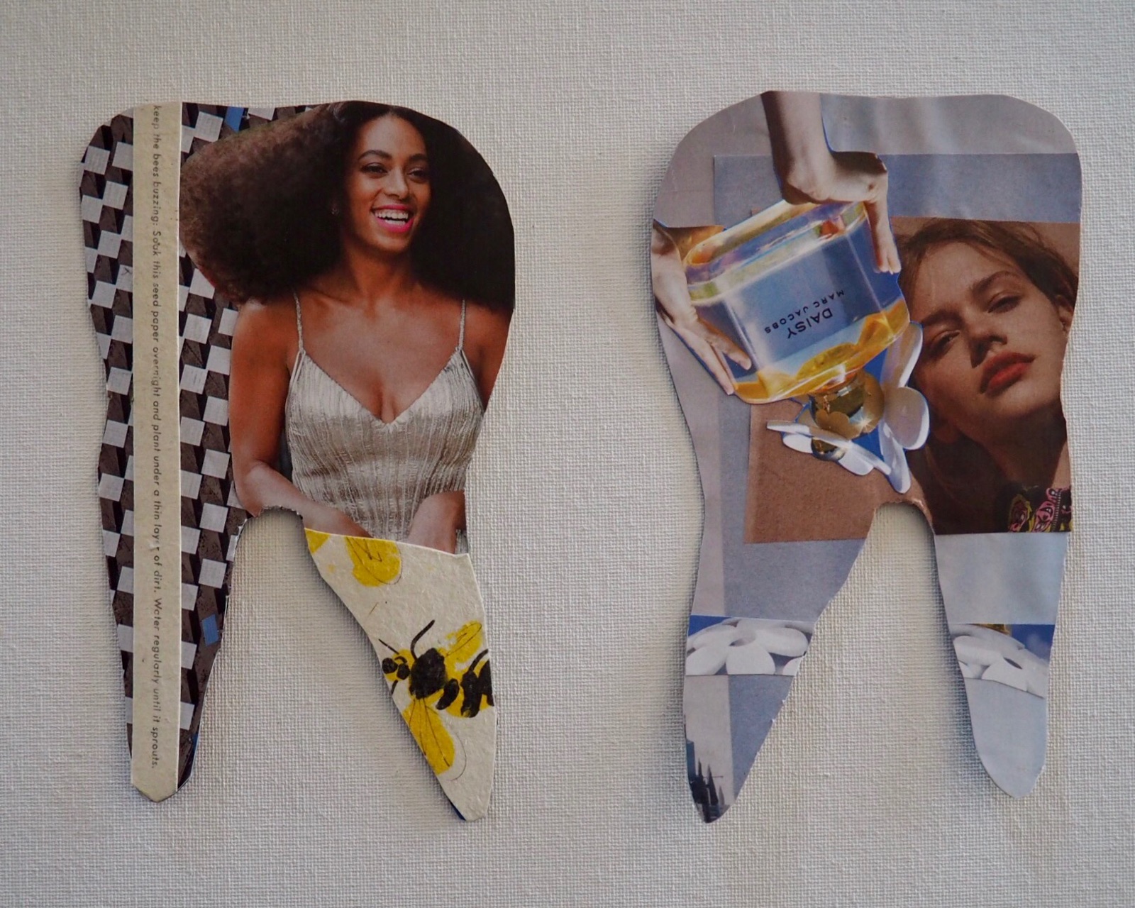 Teeth as a symbol in my work draws on Jungian dream interpretation: dreams of your teeth falling out reflect fears about aging. In the case of womanhood, aging means becoming invisible in society. Teeth, to me, also represent anger and aggression- two things women aren't supposed to express according to sexist gender roles.